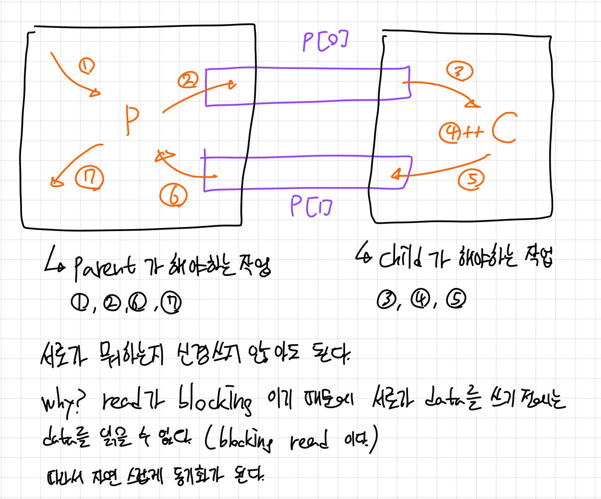 정답은 "파이프는 기본적으로 blocking read/ blockking write를 지원하므로 자연스럽게 동기화가 된다." 이다.